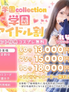 75分コース 15,000円 90分コース 18,000円 【イベント特典】 お好きなコスプレ無料 ※指名料別途2,000円 〈ご利用規約〉 一部女性適用外になります 池袋西口エリア限定ホテルでのご案内 前日ご予約不可 本指名利用不可 ※お電話にて『学園アイドル割』とお申し付けください 口コミコードご提示で